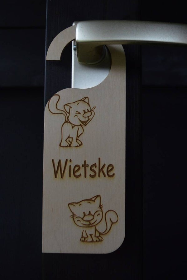 Ein Türhänger mit eingraviertem Text, einer Nachricht oder einem Firmenlogo.