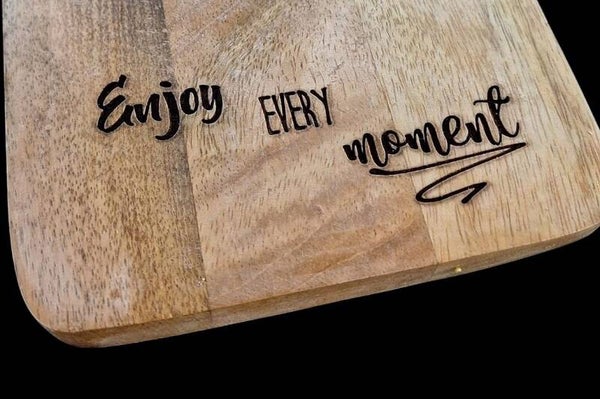 Das Mangoholzbrett 27cm kann mit einem Text, einer Nachricht oder einem Firmenlogo graviert werden.